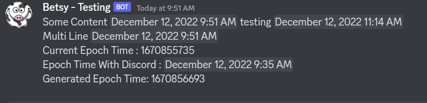Anytime you send a message through Betsy the message will be interpreted by our templating engine which will format the message before it is sent to discord. Allowing you to do various things like inserting a time, date, parameter, and so much more.