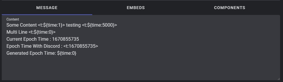 Simply include our templating tag anywhere into the discord message and watch the magic happen. For example lets say you want to have a formatted date time that is 3600 seconds (1 hour) in the future. Anywhere in your message simply add <t:${time:3600}> to show a formatted date in the future.